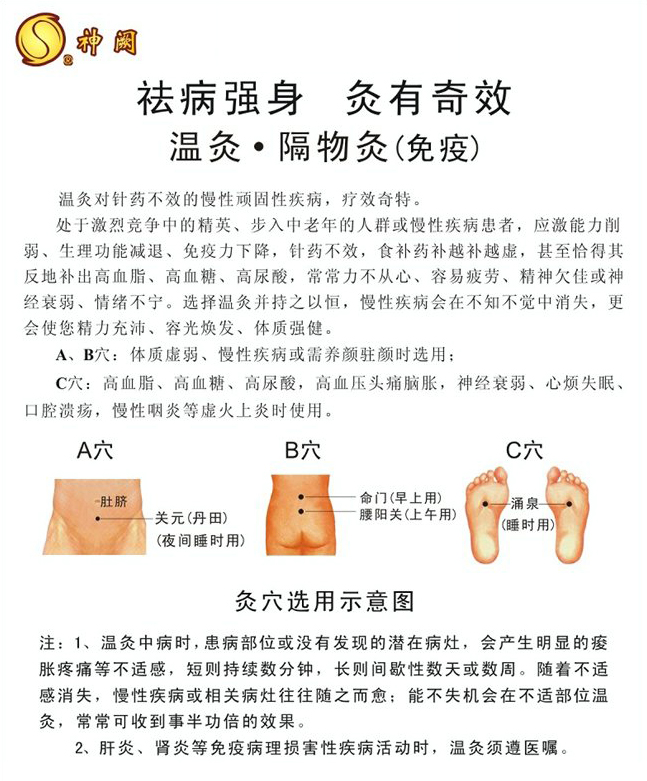 對人體的神經(jīng)、內(nèi)分泌免疫、消化、呼吸、循環(huán)、泌尿與生殖等系統(tǒng)的功能具有顯著的調(diào)節(jié)作用,神闕版溫灸隔物灸,隔物灸通過對穴位的持續(xù)溫灸,疏通。