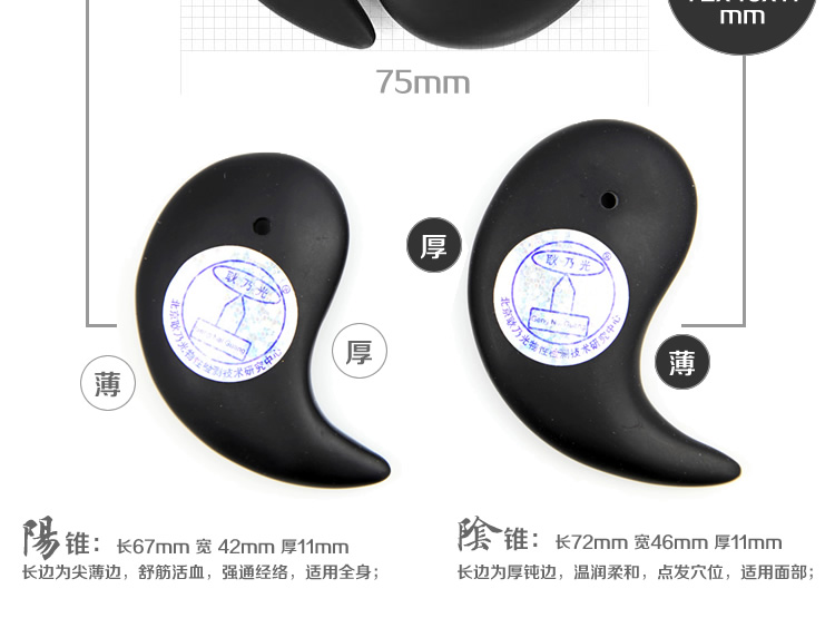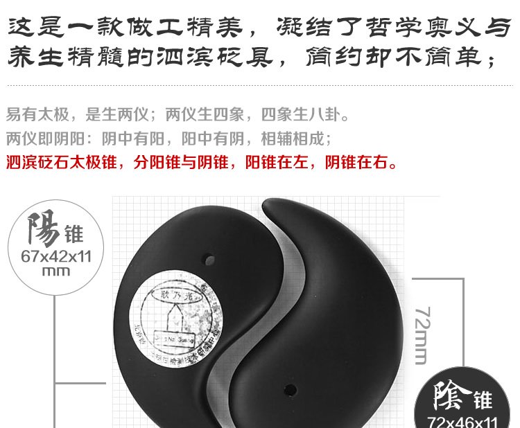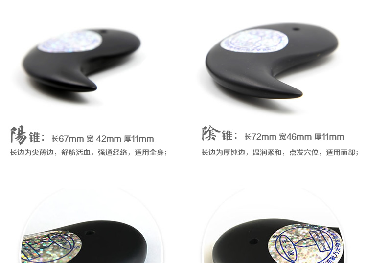 陰陽太極錐砭石刮痧板,也稱八卦太極砭石或砭石陰陽佩,是由天然泗濱浮石加工而成的具有理療功效的砭石養生保健器具。陰陽太極錐砭石刮痧板做工精細,尺寸規格大,外形獨特,符合人體骨骼結構特征,常用于面部美容刮痧及全身穴位保健。陰陽太極錐砭石刮痧板質地細膩,經拋光打磨后,手感潤滑,使用舒服。